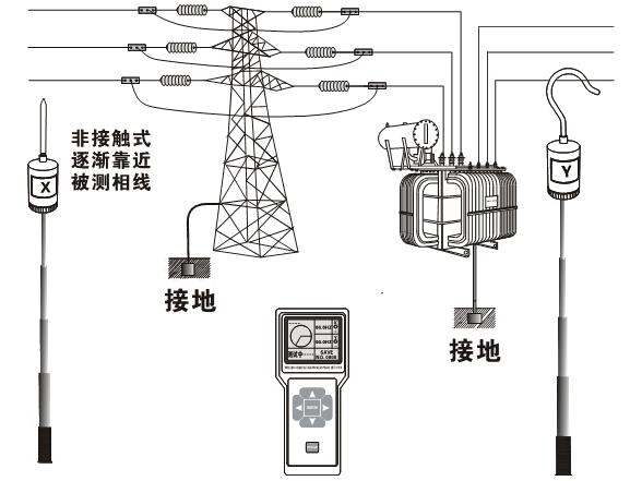 非接觸式核相:當裸線路電壓超過35kV時,必須采用非接觸測試,探針逐漸靠近導線核相