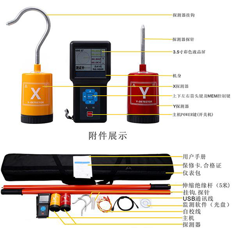 主機1件、探測器2件、探針2件、探勾2件、絕緣桿2件、軟件光盤1件、USB數據線1根、LR6電池6個、6F22電池2個、檢驗線1條、工具包1件