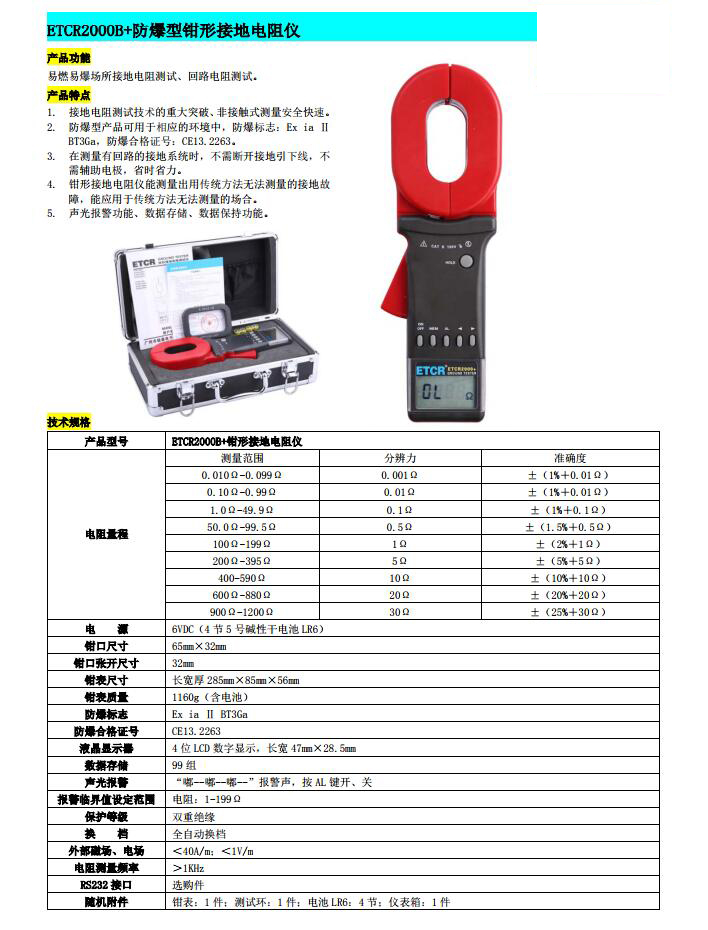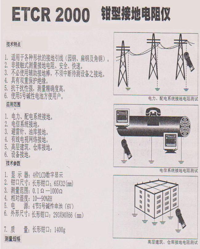 ETCR2000型鉗形接地電阻測試儀是傳統接地電阻測量技術的重大突破,廣泛應用于電力、電信、氣象、油田、建筑及工業電氣設備的接地電阻測量。