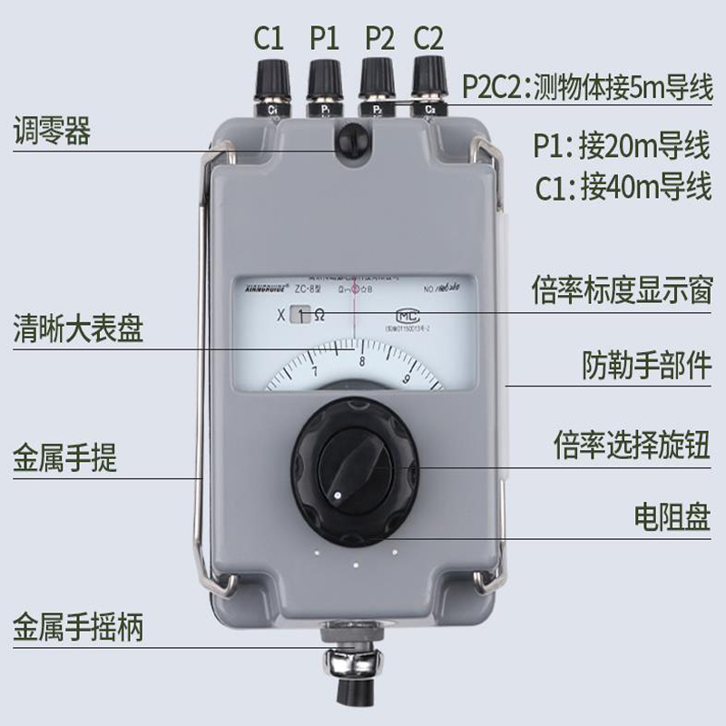 ZC-8接地電阻測試儀采用最傳統的打地樁方法測量各種接地裝置的接地電阻值,適用于直接測量各種接地裝置的接地電阻值,亦可供一般低電阻的測量,還可以測量土壤電阻率。