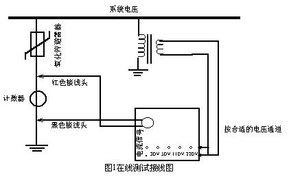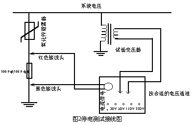 試驗線路如圖 2所示。接線時請取一只 100Ω~200Ω電阻串在氧化鋅避雷器與地線之間,以保證試驗回路聯通。